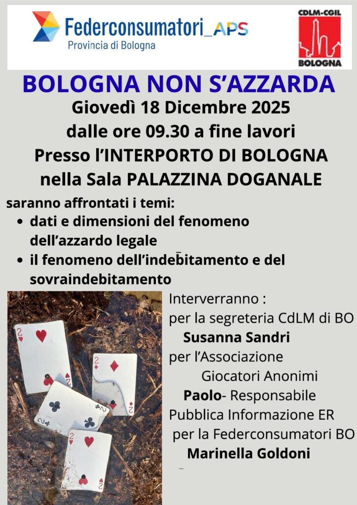 Il giorno 18 Dicembre 2025, presso l’Interporto di Bologna, nella sala Palazzina Doganale, si terranno due incontri sul tema del gioco d’azzardo, rivolti principalmente ai lavoratori, in quanto categoria fragile rispetto al tema trattato.